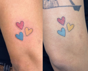 Zoals je hier kunt zien (links is net gezet, rechts is 6 weken later), zijn de kleuren na het genezen iets vager, maar nog steeds goed zichtbaar. Rood is na genezing dieper, blauw is iets lichter, en omdat geel het dichtst bij de huidskleur zelf komt, is die het minst leesbaar.