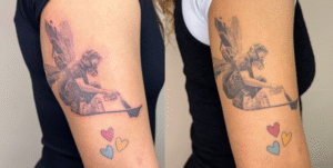 Bij deze tattoo (ook door Demi) zie je minder verschil tussen links (net gezet) en rechts (6 weken na genezing).